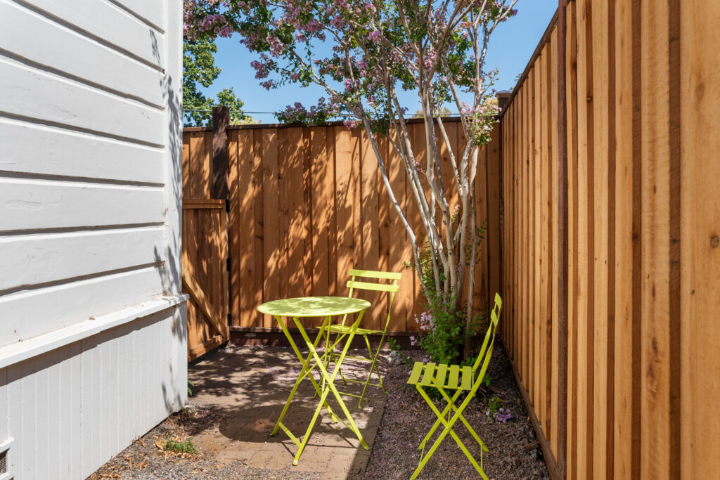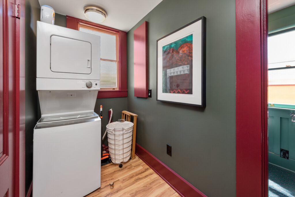 Heartwood Guest House includes a private entryway, full laundry area, and enclosed patio space. Plenty of storage shelves and curated artwork make this the perfect home-away-from home in the center of Healdsburg.
