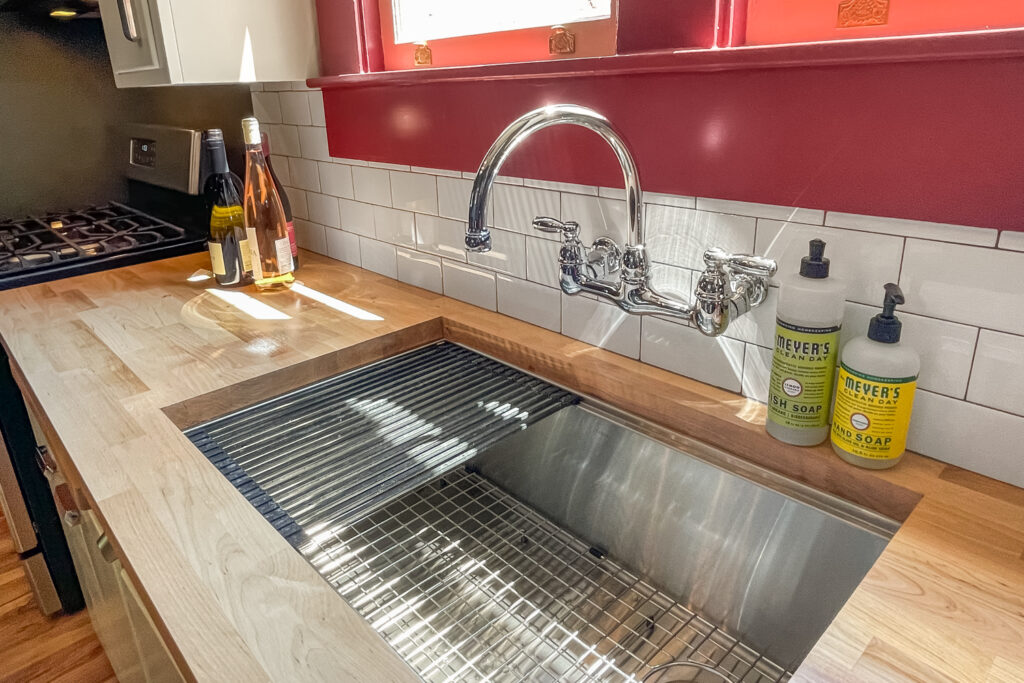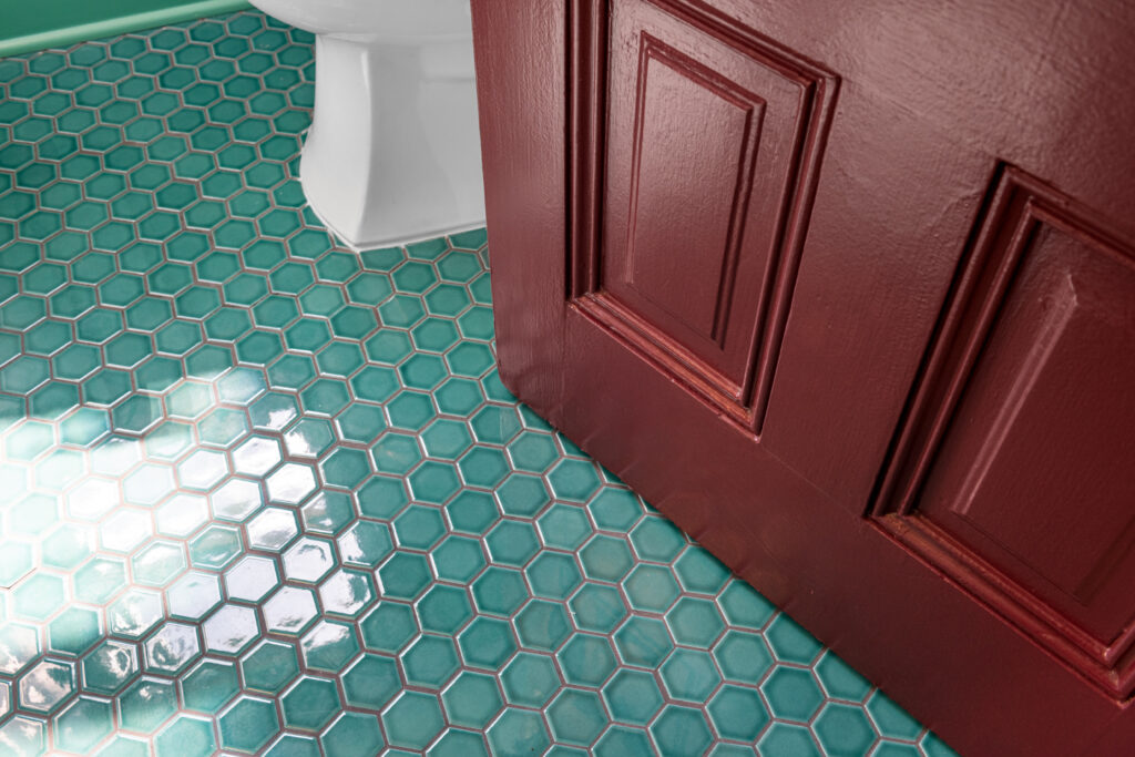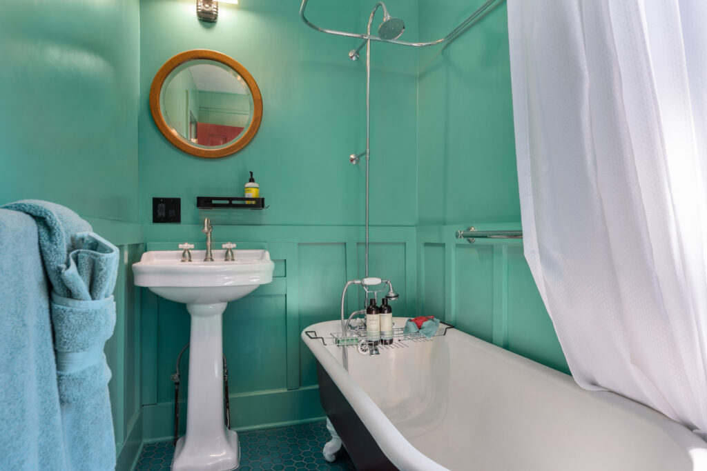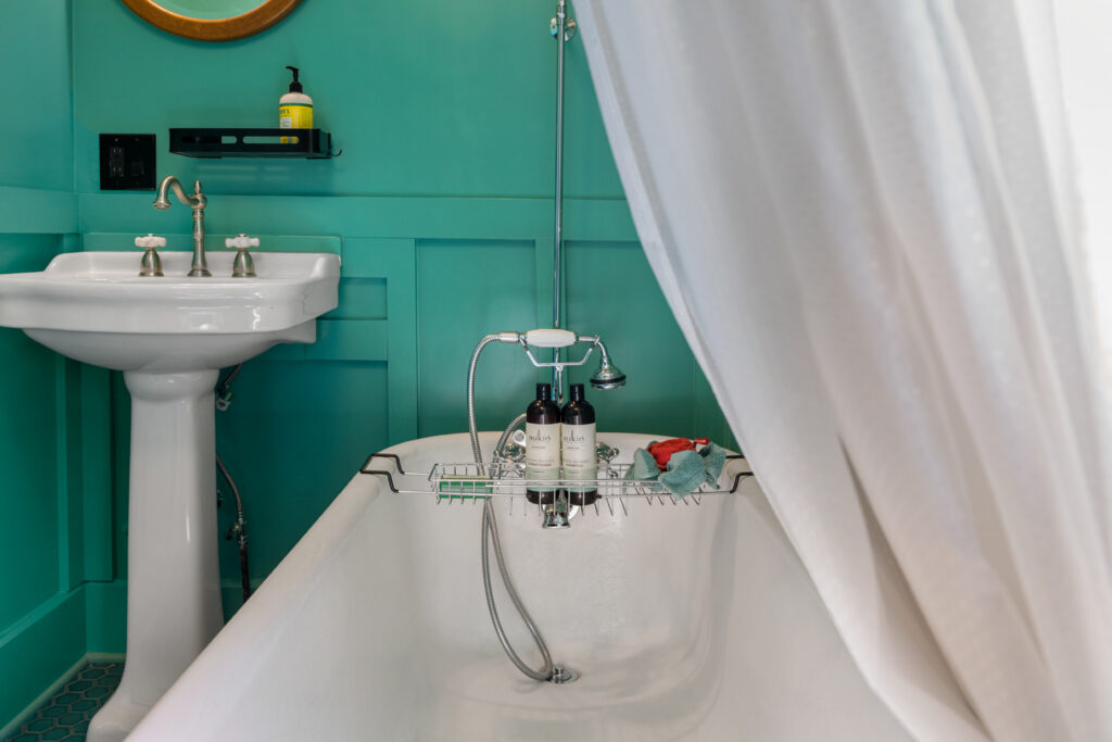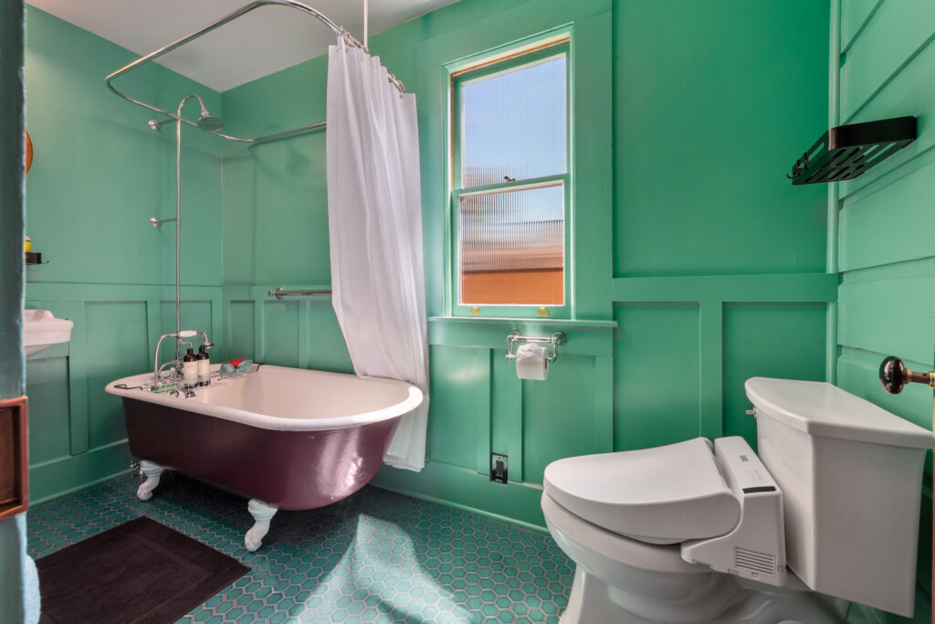 The vintage-inspired emerald bathroom features the original clawfoot tub, toto washlet toilet, accessible grab bars, and lots of natural light. Glossy hex tiles and modern details bring this 1934 space into the 21st century.