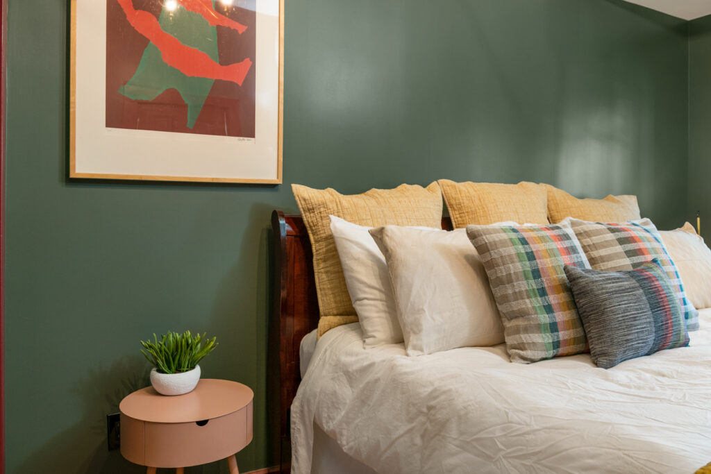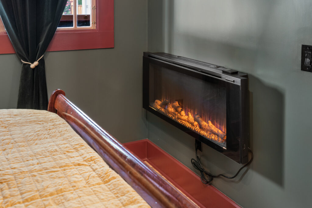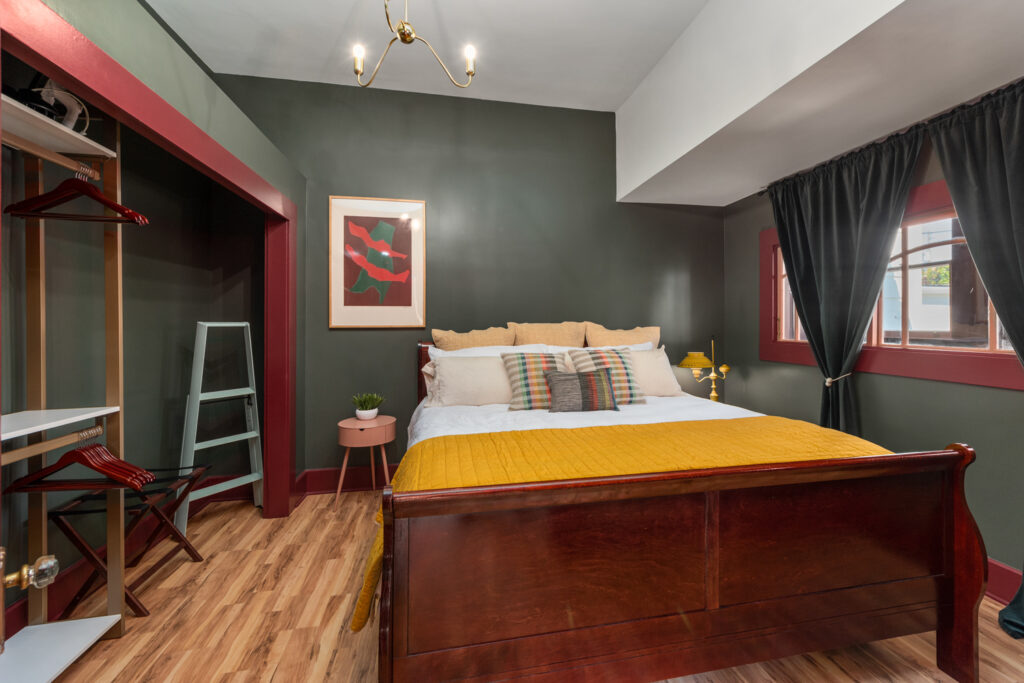The bedroom features a king size bed with Tuft & Needle mattress and large storage area with built-in wardrobe. Original windows look out into the back hall. An electric fireplace provides supplemental heat or just a cozy ambiance. Eclectic colorful furniture adds a mix of classic and modern design.
