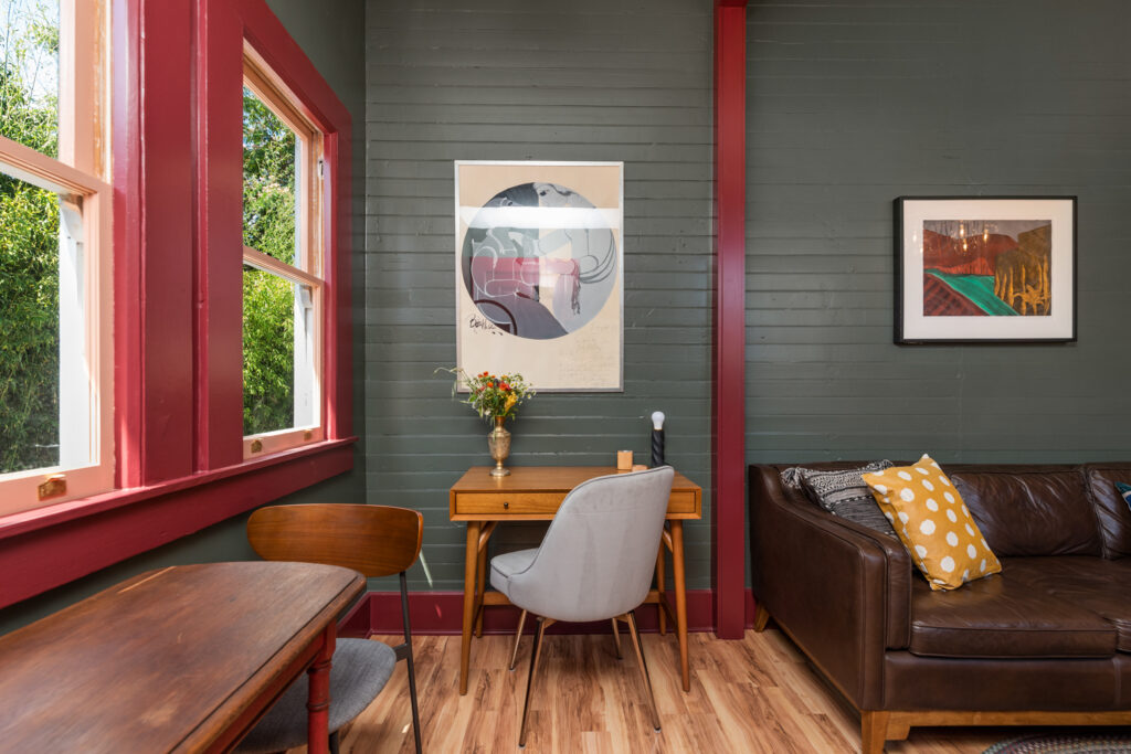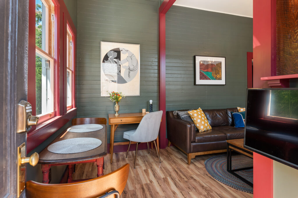 The multipurpose room features a full size kitchen, living area with SmartTV, and flexible furniture for working and dining. Original redwood beadboard walls and 10′ high ceilings are some of the circa 1880 details showcased by natural light streaming through restored windows.